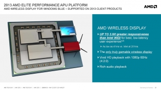 Interessante la tecnologia AMD Wireless Display che risulta più efficiente di quella Intel WiDi fino a 3.9 volte con una latenza di soltanto 41ms contro i ben 201ms di Intel. Inoltre, molto importante, grazie a questa latenza così bassa è l'unica tecnologia che permette di giocare con monitor wireless.