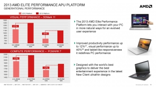 Infine AMD propone Richland per quanto riguarda la piattaforma Performance. Questa è caratterizzata da nuove performance di riferimento che arrivano ad un +71% rispetto ad un Intel Core i5 e nuove performance nel boot e dispositivi simil-tablet grazie alla tecnologia AMD Start Now Technology. Nuove user experiences con AMD Face Log-in, AMD Gesture Control e AMD Screen Mirror. Nuovi riferimenti anche per la durata della batteria dove arriviamo ad una autonomia di ben 10 ore e più di 7 ore e mezza per quanto riguarda il web browsing.