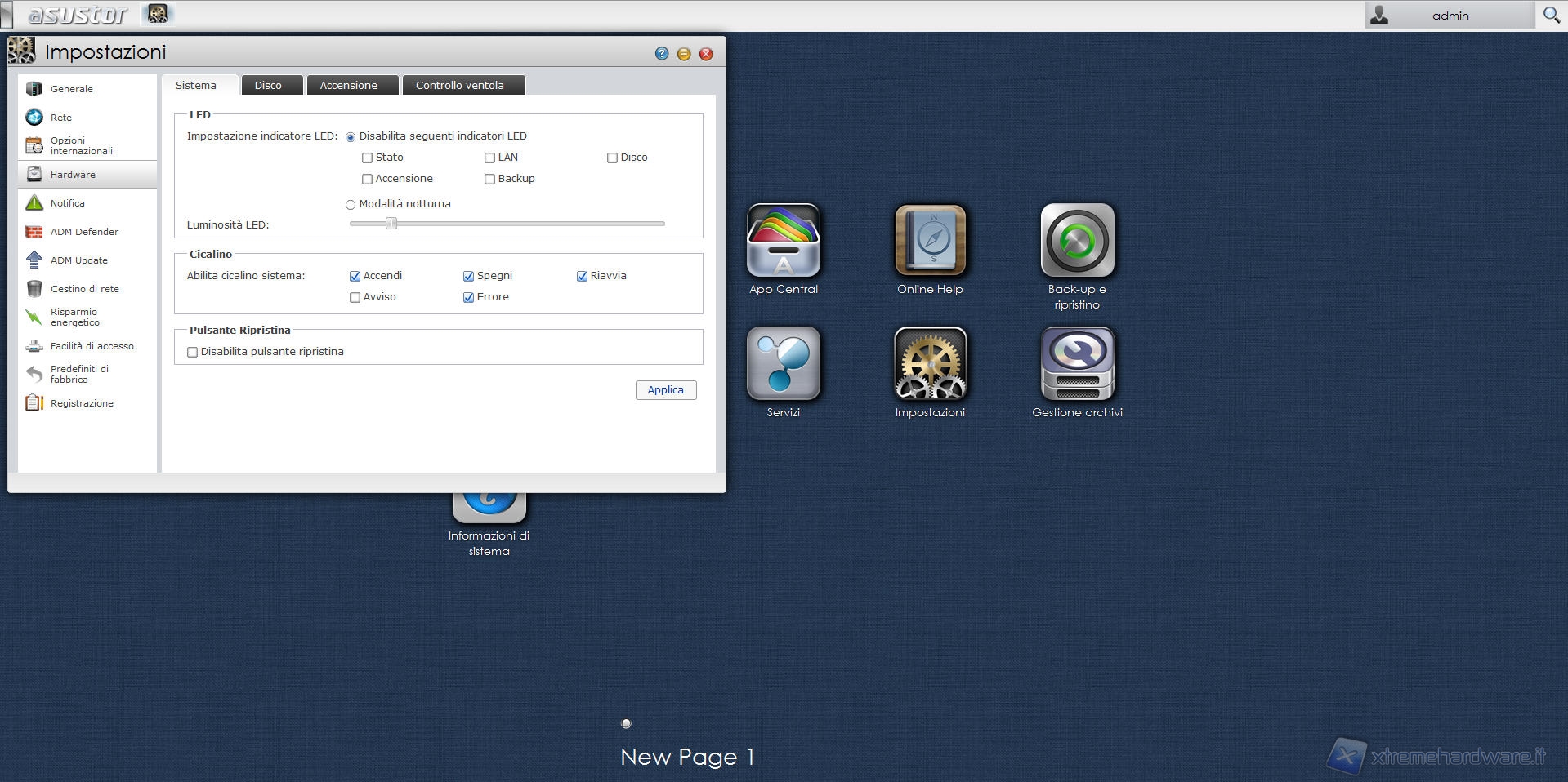 All'interno della scheda “Sistema” possiamo disabilitare i LED di sistema, impostarne la luminosità e configurare il cicalino di sistema, decidendo quando venire avvisati da un suono.