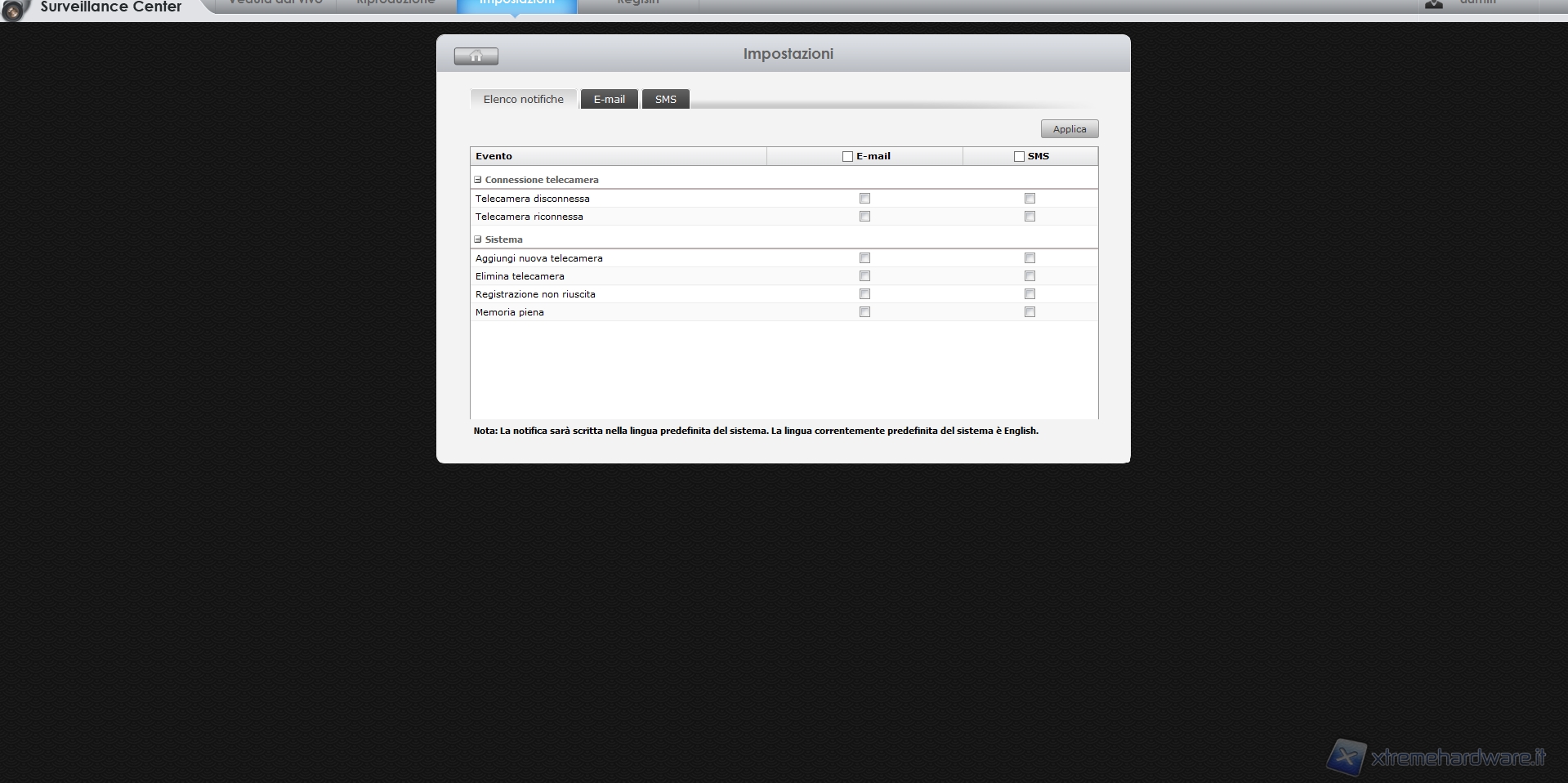 Notiamo che tra le scelte più interessanti troviamo quelle di inviare notifiche nel caso una telecamera venga disconnessa, nel caso in cui venga effettuata una registrazione non riuscita o nel caso avessimo esaurito lo spazio disponibile in memoria, impedendo nuove registrazioni.